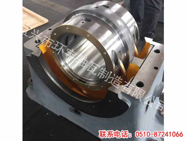 瓦塊上的銷釘孔設(shè)在違背基地7.54mm處,因而瓦塊的工作面和推力盤之間就構(gòu)成了楔形空隙。當(dāng)推力盤滾動時油在楔形空隙中遭到揉捏,壓力提高,因而這層油膜上具有接受轉(zhuǎn)子軸向推力的才能。裝置環(huán)安頓在球面座上,油通過節(jié)流孔送入推力軸承進(jìn)油室,分為兩路經(jīng)推力軸承球面座上的進(jìn)油孔進(jìn)入主軸周圍的環(huán)形油室,并在瓦塊之間徑向流過。在瓦塊與瓦塊之間留有寬敞的空間,便于油在瓦塊中循環(huán)。